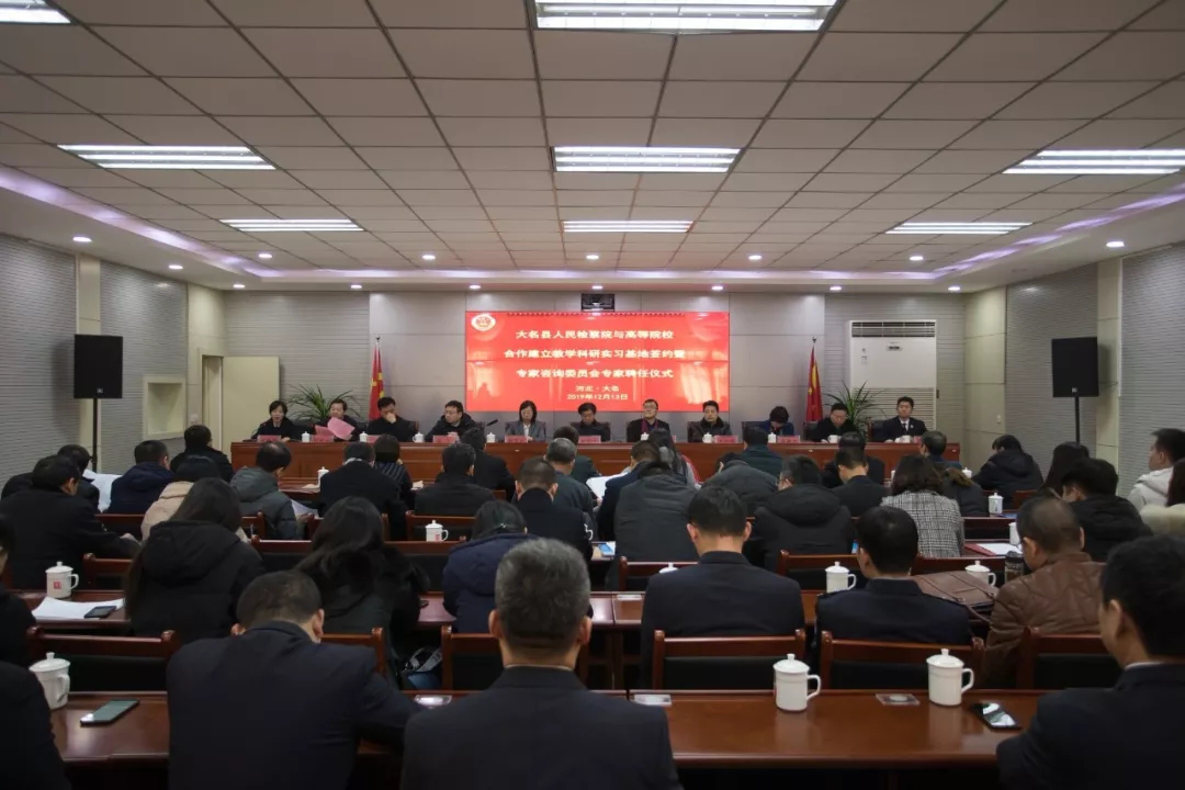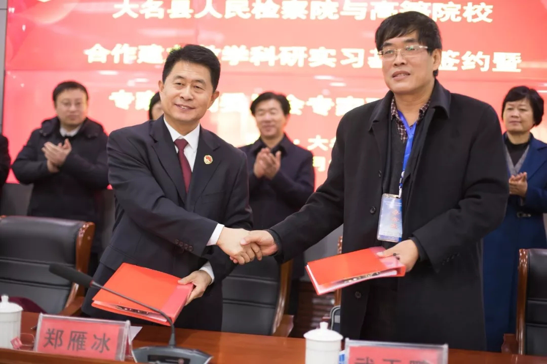 12月13日,开云官网与大名县人民检察院举办共建“教学科研实习基地”签约授牌及专家咨询委员会专家聘任仪式。开云官网党委书记武玉鹏、院长王利军、硕士生导师刘义青等人参加;大名县委书记房延生、县委副书记李建方、政法委书记杨建洲等县委领导出席活动以及大名县人民检察院全体成员及干警代表出席签约、聘任仪式。