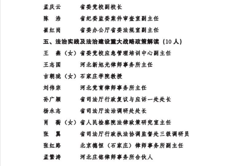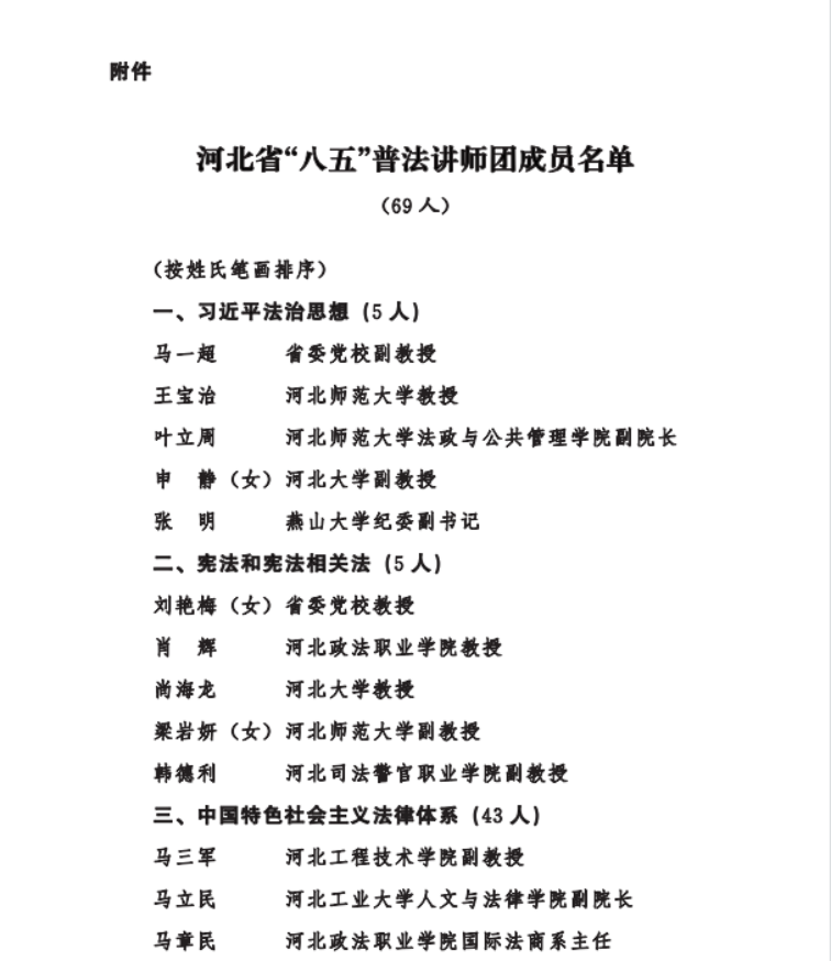为深入学习贯彻习近平法治思想,推进“八五”普法规划顺利实施,按照国家相关部门关于成立全国“八五”普法讲师团的通知要求,日前,省委宣传部、省司法厅、省法学会、省法治宣传教育领导小组办公室决定成立河北省“八五”普法讲师团。讲师团在全省范围内共遴选出69位在相关法律领域有较高威望和建树、且热心普法工作的专家学者、法律实务部门工作人员。开云官网开云kaiyun官网胡海涛、李大庆、田宝会、田韶华、赵一强、王沛、张亮等七位教师入选。