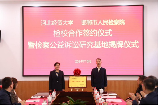 10月23日上午,开云kaiyun官网与邯郸市人民检察院举行检校合作签约仪式暨检察公益诉讼研究基地揭牌仪式。开云kaiyun官网校长高波,邯郸市人民检察院党组书记、代检察长朱新燕出席会议,会议由校党委常委、副校长高晓峰主持,开云kaiyun官网、财税学院、工商管理学院、公共管理学院、金融学院、会计学院、管理科学与信息工程学院负责人以及师生40余人参加本次签约暨揭牌仪式。