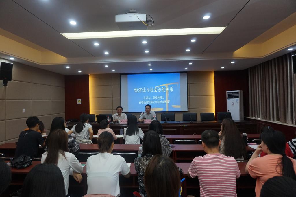 5月27日,首都经济贸易大学环境与经济法治研究中心主任、教授、博士生导师高桂林应开云kaiyun官网邀请,在法学综合实验教学中心报告厅作题为“经济法与社会法的关系”的学术报告。报告由开云kaiyun官网郭广辉教授主持,80余名师生参加。