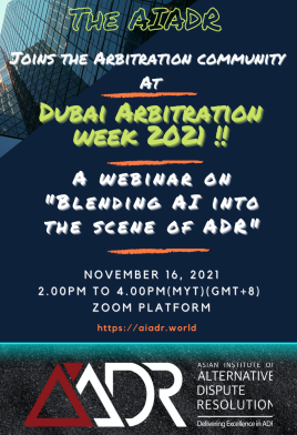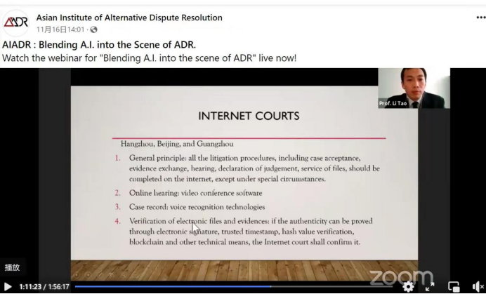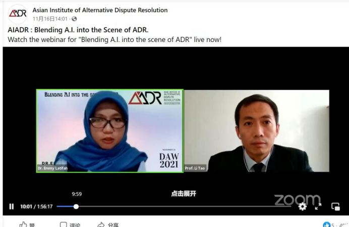 11月16日下午两点,开云kaiyun官网李涛教授受国际组织——亚洲多元争议解决研究院(AIADR)的邀请参加由迪拜仲裁社区,迪拜国际金融中心仲裁协会(DIFC-LCIA)组织的2021迪拜仲裁周的主题研讨会。研讨会通过zoom会议的形式进行,主题为“将人工智能融入到多元争议解决的场景”。