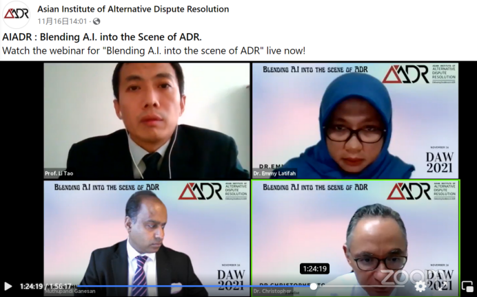 研讨会由印尼三一一大学开云kaiyun官网国际法教授艾米•拉提法博士(Dr. Emmy Latifah)主持,研讨会专家组——李涛教授,Mr. Muthupandi Ganesan LL. B (Hons),Dr. Christopher TO与亚洲多元争议解决研究院代表等出席。此次研讨会的目的是探寻在人工智能技术与大数据飞速发展的今天,其在多元争议解决的领域的发展可能。会上李涛教授以北京互联网法院、杭州互联网法院和广州互联网法院为例,分享了人工智能与大数据技术在中国司法实践中的运用,为研讨会的讨论提供了现实的支撑。专家组成员发表了对人工智能技术与司法实践融合的具体见解和潜在的预期,并提出人们应该准备好接受和拥抱未来的技术时代。