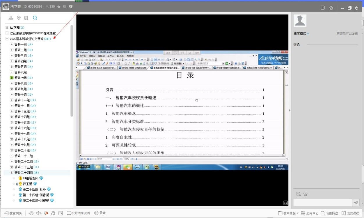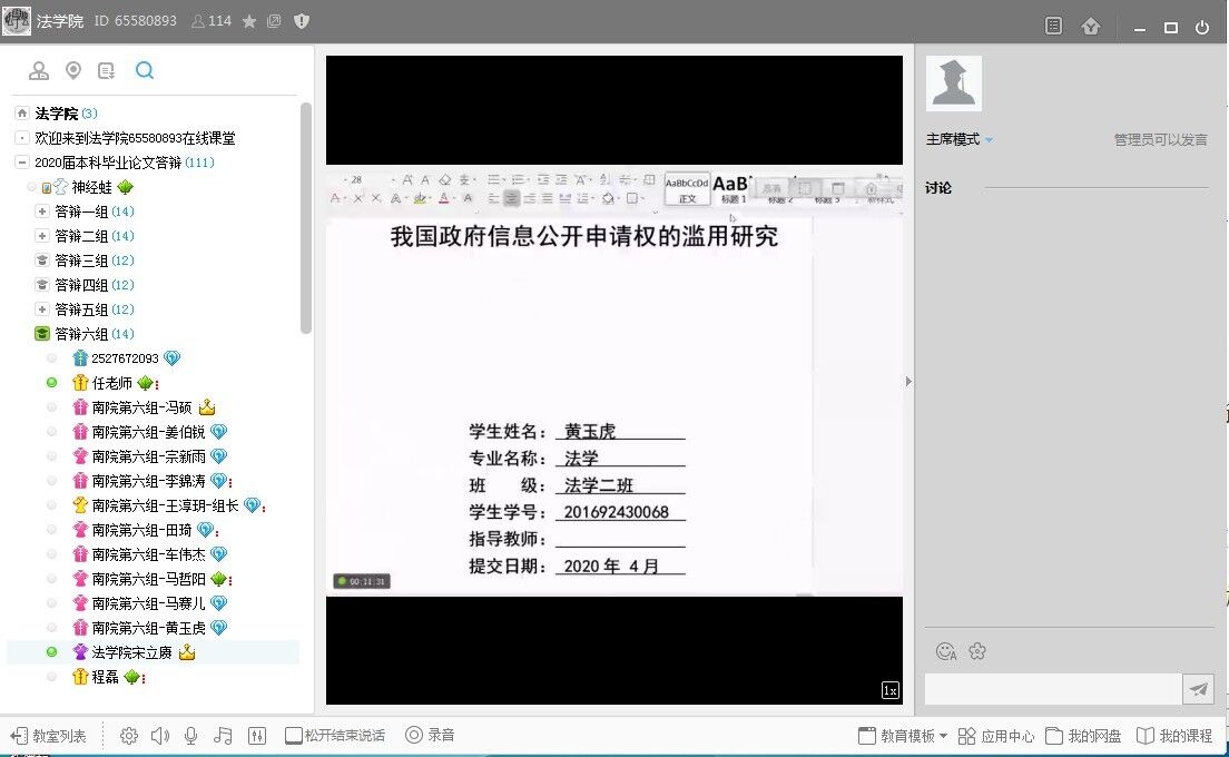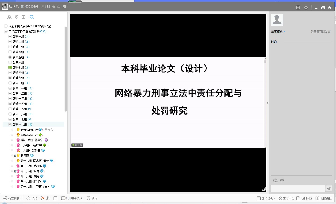 经过前期的反复演练和模拟,全体答辩师生能够熟练使用YY语音平台。答辩过程中,按照既定答辩流程,各个答辩小组的答辩进程井然有序。主问老师利用桌面分享、系统书写白板等工具,有重点、有针对性的展示学生论文(类似法庭证据展示系统),并指出问题之所在。师生通过系统视频、语音系统实时交互。整个答辩过程不但在答辩师生之间沟通交流,而且藉由视频、图片、语音等方式,实时展现给所有参与答辩的学生和督导巡视人员。高度仿真现场答辩情境,且实际效果优于现场答辩。