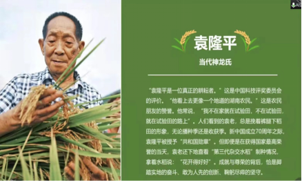2021522日,袁隆平院士逝世,举国哀悼。袁隆平院士是我国研究与发展杂交水稻的开创者,被誉为“杂交水稻之父”,在2019年被授予“共和国勋章”。王越同学说:“袁隆平院士成就与荣誉的背后,恰是假踏实地的奋斗,敢为人先的创新,鞠躬尽瘁的坚守。人们看到的袁老,总是挽着裤腿儿,下到田间的形象,袁隆平先生是一位真正的耕耘者。”袁隆平院士将活在我们每一个人心中,我们要永远缅怀我们最敬爱的袁隆平院士!