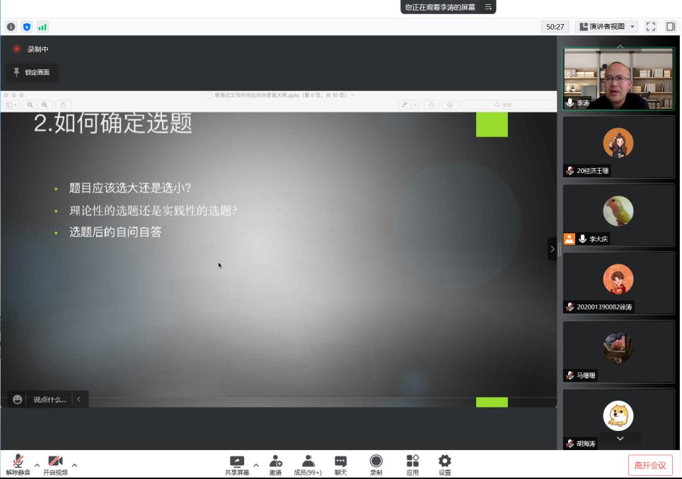 5月4日下午,开云kaiyun官网邀请湖北省社科院李涛编审作题为“学术论文的选题、写作及规范”的线上专题讲座,开云kaiyun官网副院长李大庆主持本次讲座,130余名研究生参加。