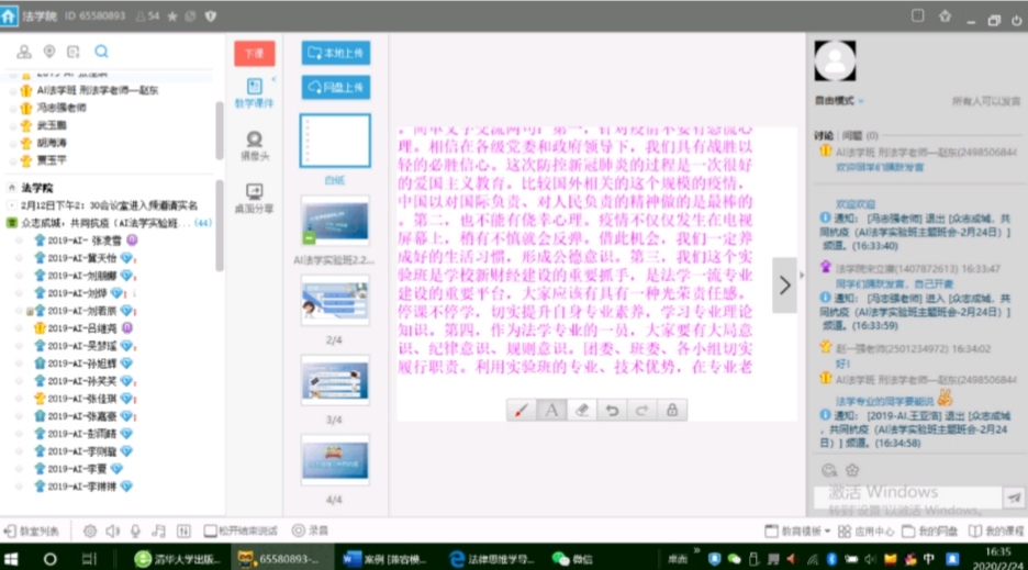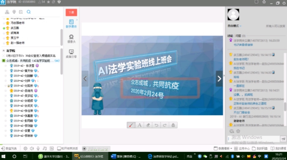 2020年2月24日,AI法学实验班通过yy语音平台召开了一次别开生面的“众志成城、共抗疫情”主题班会。在这个举国上下共抗新冠疫情的特殊时期,开云kaiyun官网师生的情感沟通并没有被分隔两地不能相聚校园的现实所阻碍。班会上不但全体同学早早到了开云kaiyun官网yy语音频道,学院党委书记武玉鹏、班主任胡海涛,宋立赓、冯志强、赵一强、赵东等老师等听说线上班会的消息后,都赶来参加班会,与同学们分享假期收获并体验线上教学的感受。